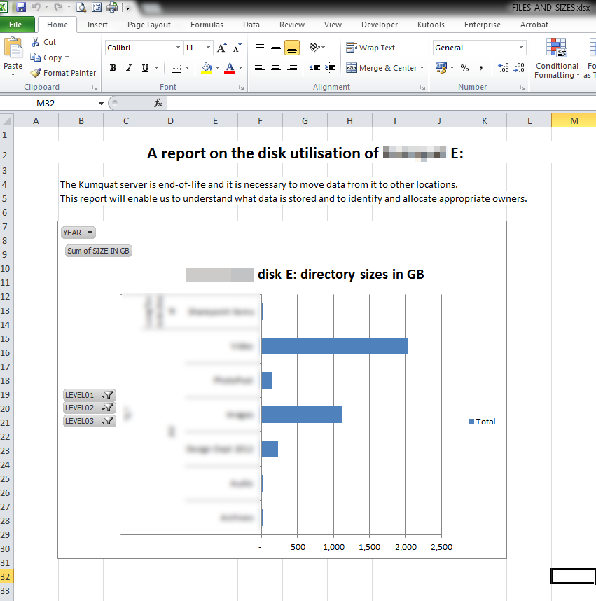 As soon as you try to get this information at the command prompt you quickly run up against the problem that Windows does not report directory sizes and the standard listing “dir /s” is unsuitable for creating a CSV file. However after a bit of Googling and some debugging (yes, some users do put commas in file names) I have written a batch file that creates a suitable CSV file.