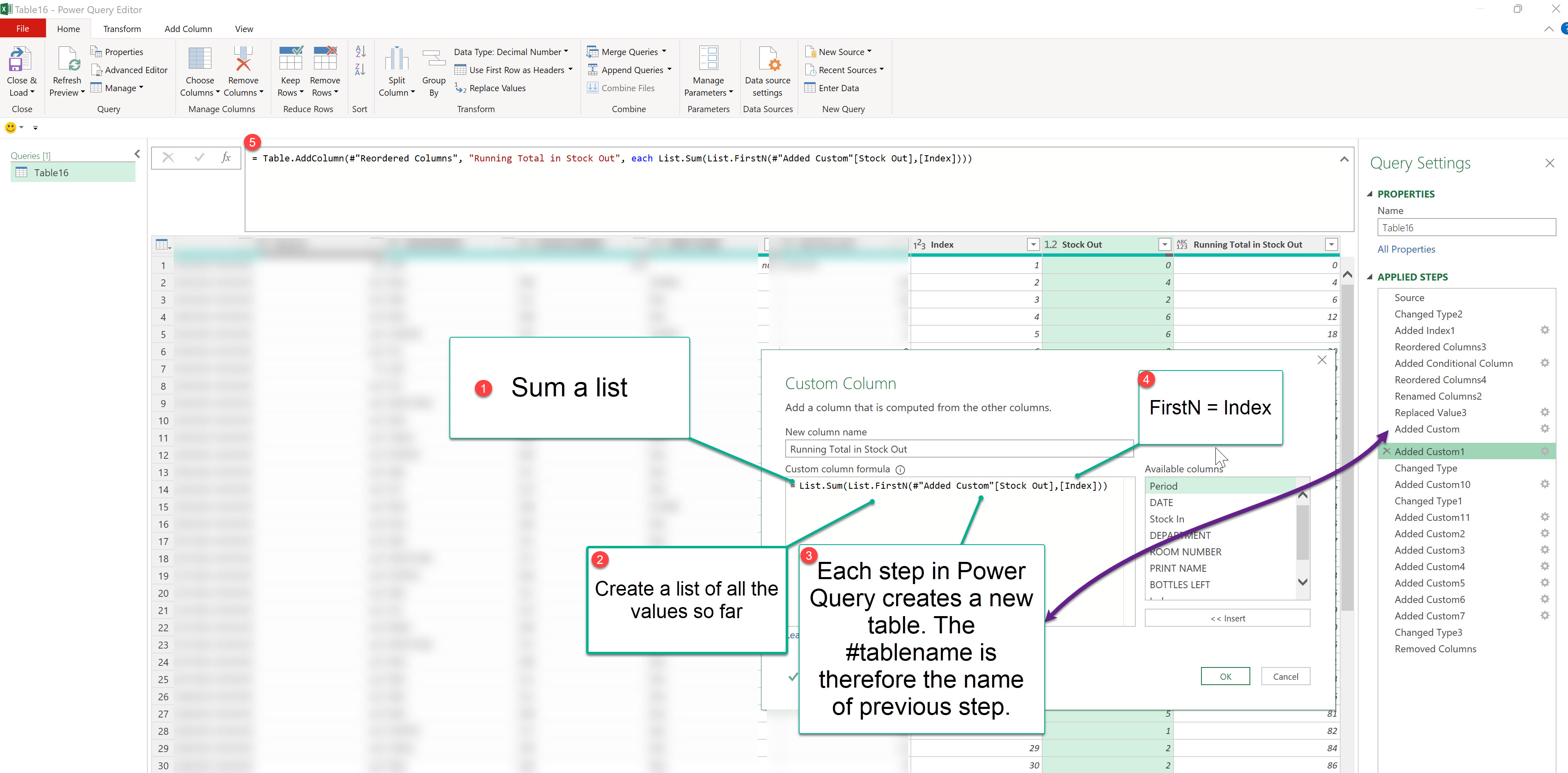 - The source list of the List.FirstN() is the [Stock Out] column in the previous step. This is referenced as #”Added Custom”[Stock Out] because the previous step was called “Added Custom”.