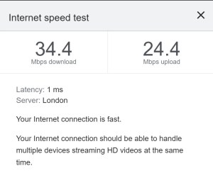The speed I am getting is about half what I got from ‘fibre to the cabinet’ but it is fine for everyday use. The latency is very good and my Windows PC seems snappier perhaps because in this new cloud first world all every app is pinging a server all the time.