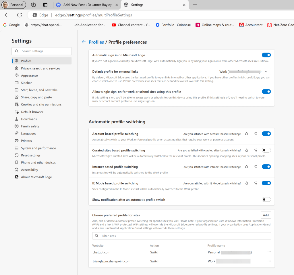 To fix this you can enable auto switching of profiles. You can set your default profile, or more usefully bind well know locations such as Sharepoint sites to particular profiles. The link to Edge options and my settings are shown below.