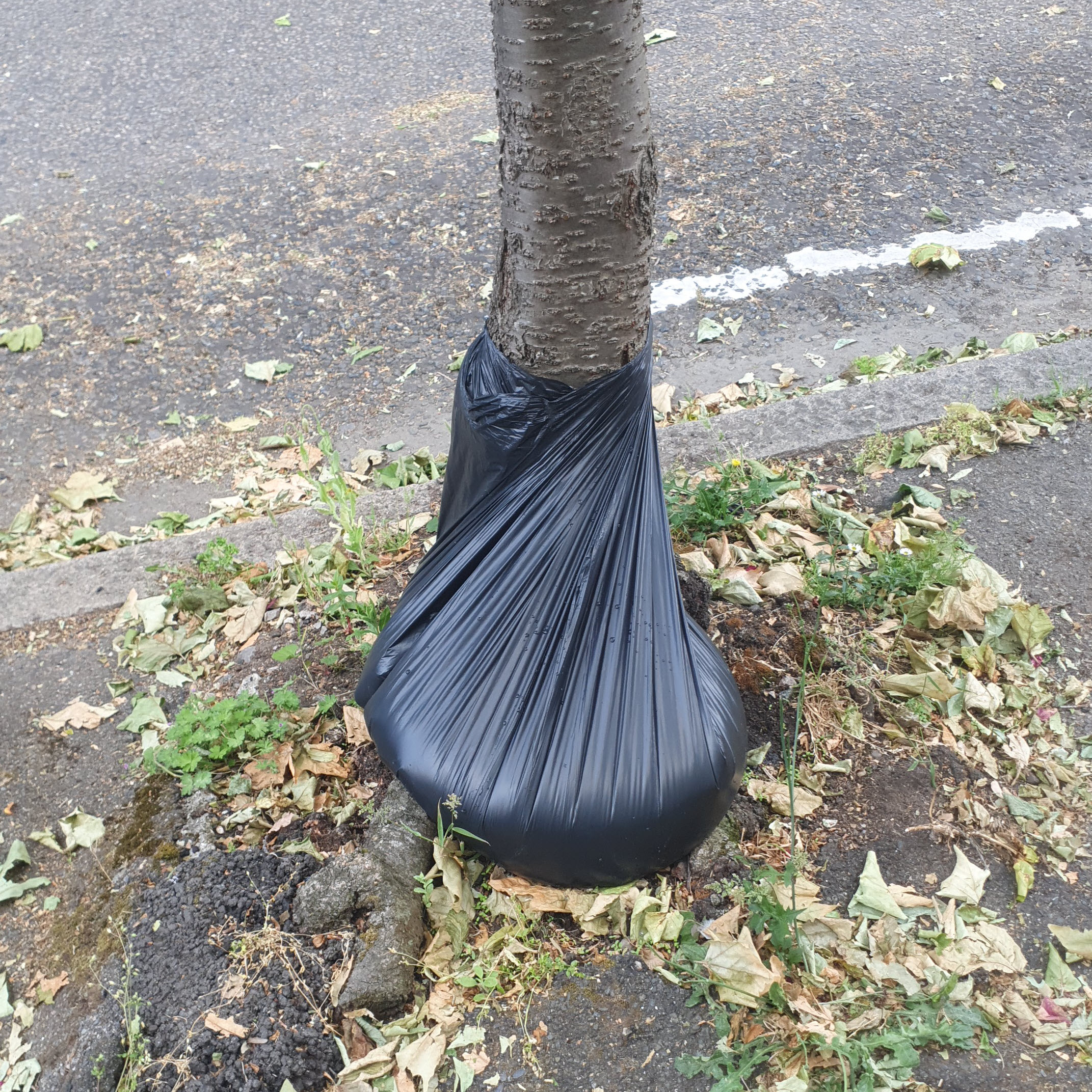 Tree watering bags are a common site in municipal parks but are not generally used at home or for street trees. This post tells you how to make your own from a black bin bag.